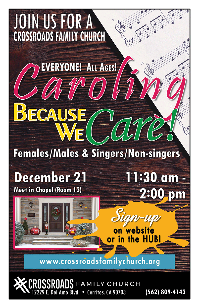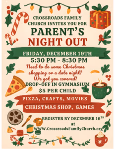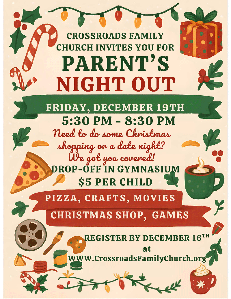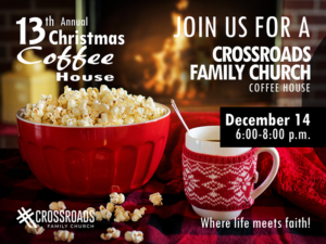 December 2025 Events Join us for a time of fun and fellowship 6:00pm – 8:00pm Crossroads Family Church 13th Anual Christmas Coffee House December 14th, 2025 5:30pm – 8:30pm Crossroads Family Church Parent’s Night Out Friday, December 19th Register by December. 16th 2025# Register 11:30am – 2:00pm Crossroads Family Church Caroling Because We Care! December 21 , 2025 (Meet in the Chapel Rm 13)